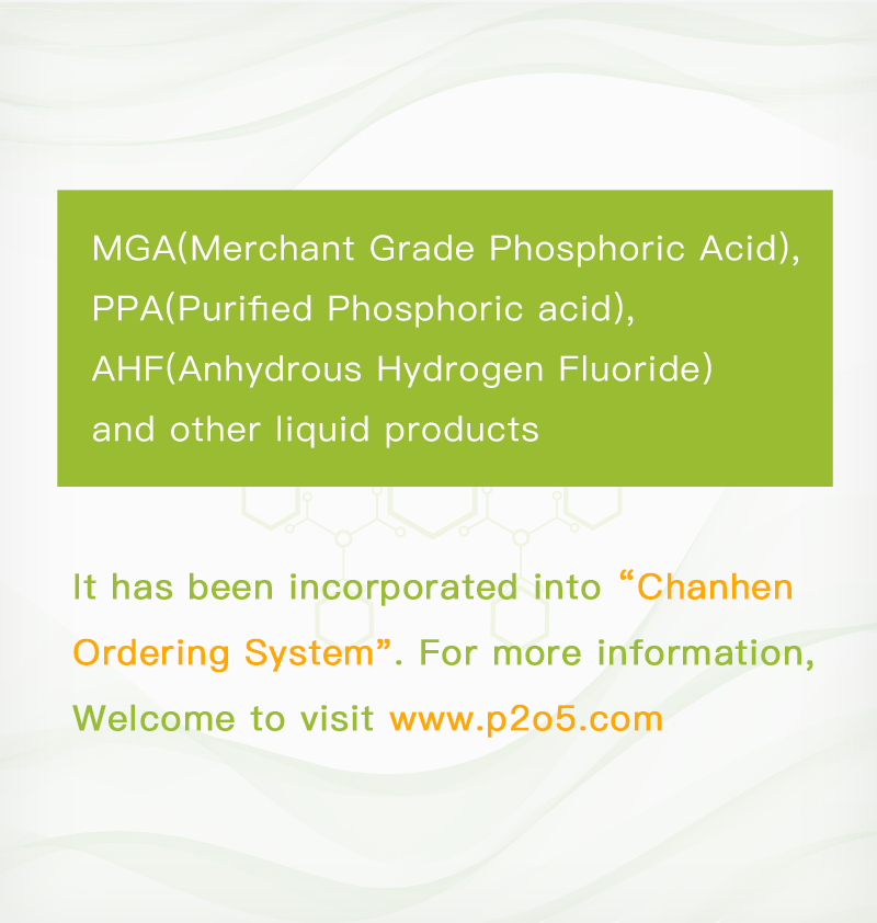 Based on "resources + technology", Chanhen provide high quality raw materials goods, including Rock Phosphate, MGA (Merchant Phosphoric Acid), PPA (Purified Phosphoric Acid), AHF (Anhydrous Hydrogen Fluoride) and other products.